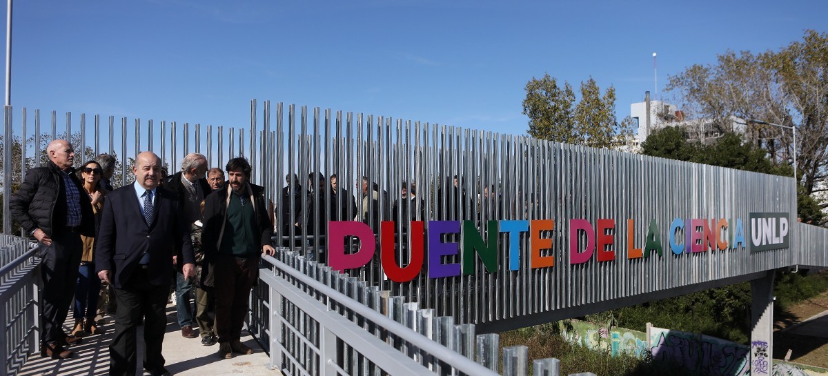 16.5.2024. Con la finalidad de vincular distintos espacios de investigación y actividades académicas que se desarrollan en el Grupo Bosque Este de la ciudad, la Universidad Nacional de La Plata inauguró esta mañana el Puente de la Ciencia. La moderna construcción de 200 metros de extensión y de uso peatonal, une todas las dependencias instaladas en el polo científico más grande del país delimitado por el boulevard 120, la avenida 60, la diagonal 113 y la calle 64 donde miles de estudiantes, docentes e investigadores transitan a diario. En la actualidad, el predio se encuentra dividido por las vías del Tren Universitario, cuyo trazado lo separa en dos partes totalmente desvinculadas
